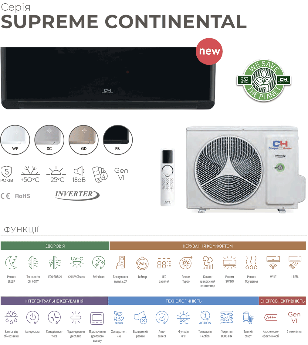 Дизайнерские блоки разного цвета. Инверторное управление. Премиальная комплектация Generation VI (энергоэффективность класса А+++). «CH 7-SKY Technology» - комплексная система фильтрации на основе семи фильтров широкого спектра действия. «CH SMART-ION Filter» - технология тотальной очистки воздуха нового поколения. Самоочистка внутреннего блока. ; I Feel — встроенный датчик температуры в пульт ДУ. Многоскоростной вентилятор; Широкий воздушный поток; Экстра низкий уровень шума 18 дБ. Защита вашего дома от замерзания: функция «+8 градусов», режим «SLEEP», функция «Авторестарт»; Защита oт обмерзания наружного блока. Премиальный пульт дистанционного управления с ночной подсветкой и отображение текущего времени суток. Wi-Fi модуль, для возможности управления кондиционером через Смартфон/Планшет. Фреон R32. Работа до -25°С. Пр-во Гон-Конг. Гарантия 5 лет.