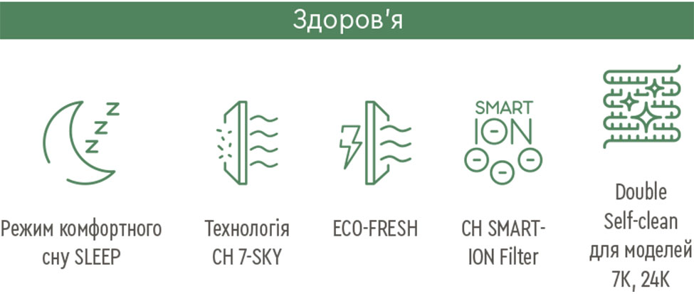 Фильтр тонкой очистки "7-Sky Technology", Ионизатор воздуха "Smart-Ion Filter". "I Feel" - встроеный датчик температуры в пульте, Авторестарт, Автоочистка, Автоматическая разморозка, Мягкий старт, Горячий старт, Низковольтный пуск, Низкотемпературный пуск, Широкоугольные жалюзи, Автоматическое качание вертикальных жалюзи, LED дисплей, Таймер 24 часа, Защита от перепадов напряжения, Защита дома от обмерзания +8°C., Турбо режим, ночной режим, авто режим, Самодиагностика, Режим комфортного сна SLЕЕР, Интеллектуальная разморозка, Антикоррозийное покрытие корпуса внешнего блока, Теплообменник с антикоррозийным покрытием GREEN-FIN, Автоматическая система защиты от обледенения.